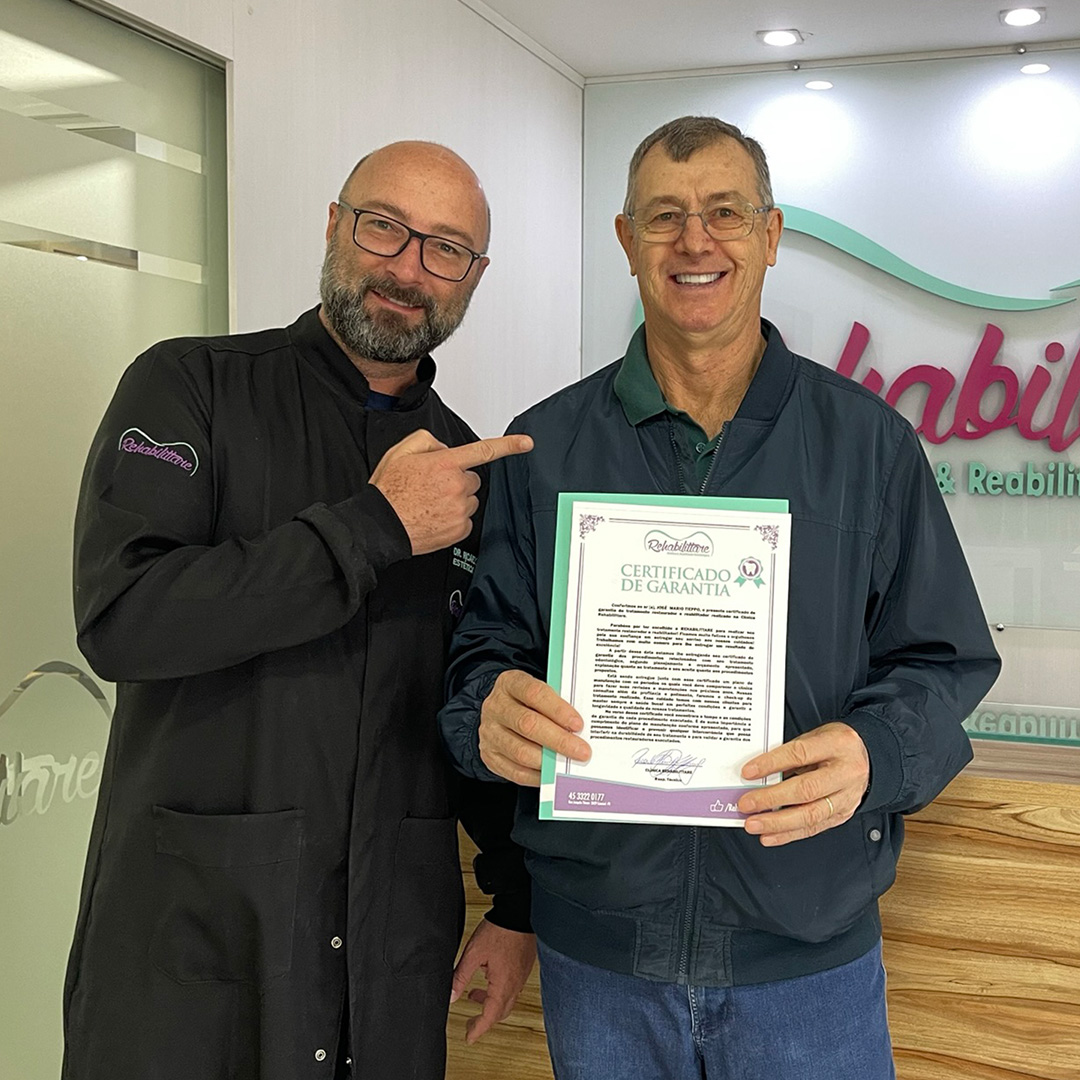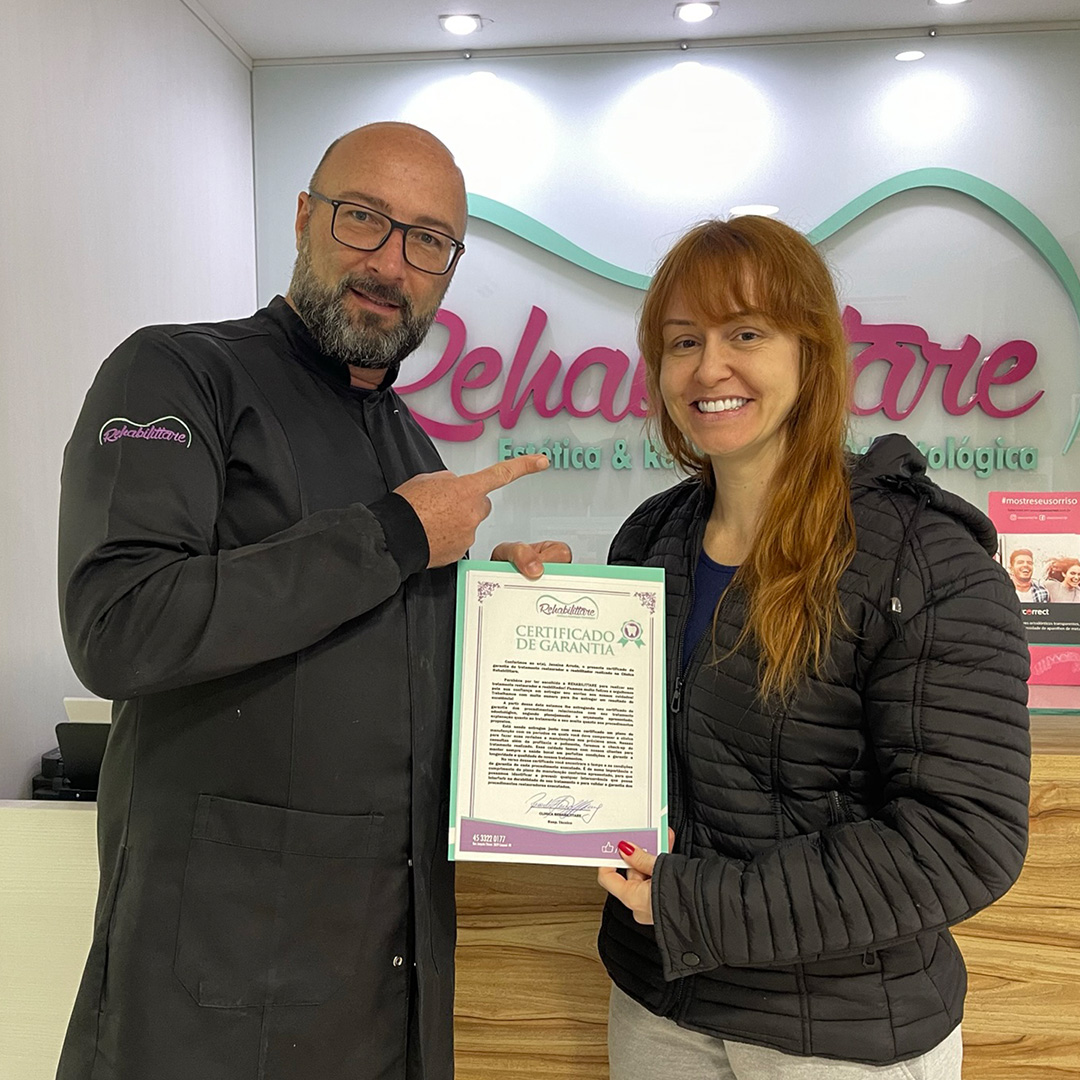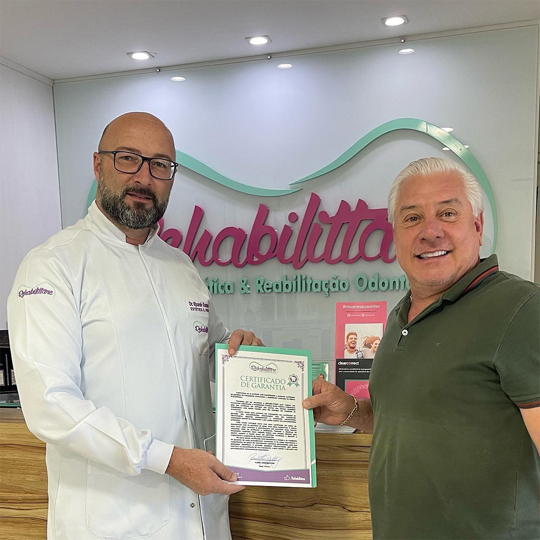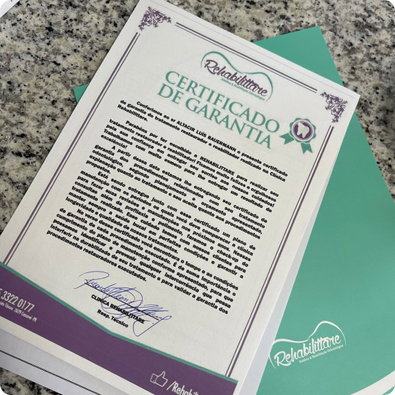 Ao término de seu tratamento, você recebera nosso EXCLUSIVO CERTIFICADO DE GARANTIA REHABILITTARE e, também, um plano de manutenção com todos os períodos que você deverá retornar para realizar sua revisão, polimento e limpeza. Garantindo, assim, a longevidade de seu tratamento e sua saúde! Afinal, quem realmente conhece o serviço que oferece, garante!